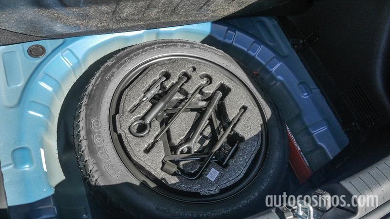 Hablando de puertas nos queda el portón trasero cuya boca alta nos hace pensar que conduce a un baúl chico. La verdad es que tenemos 303 litros, poco para un hatch del segmento C, pero más que bien si lo vemos del lado coupé. Además, podés reclinar los asientos traseros y estirar la capacidad sobre los 1.000 litros. Lo que no me gustó es lo que se esconde debajo del piso ya que se trata de una galletita en medida 125/80 R16.