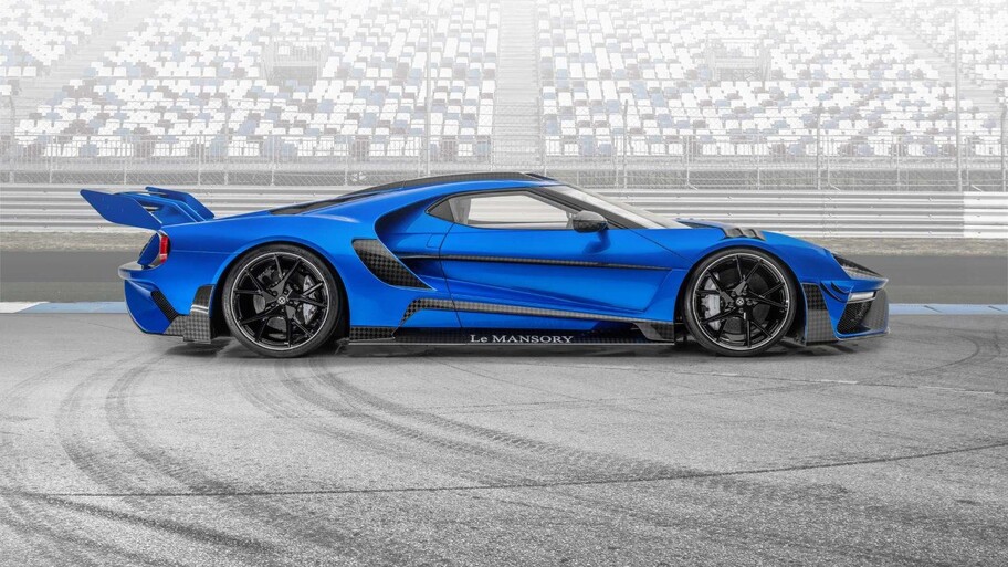 El denominado Ford GT Le Mansory presenta en su exterior un sofisticado traje azul con tintes negros hechos a base de fibra de carbono. Si hablamos exclusivamente del frente, podemos decir que nos encontramos con grandes modificaciones, que consistieron en brindarle un aspecto excesivamente agresivo. Lo primero que observamos es que la firma lumínica fue modificada por una de tecnología full LED que sobresale de los pliegues del capot, para luego detectar que el paragolpe incorpora un nuevo diseño, con entradas de aire mucho mas grandes.