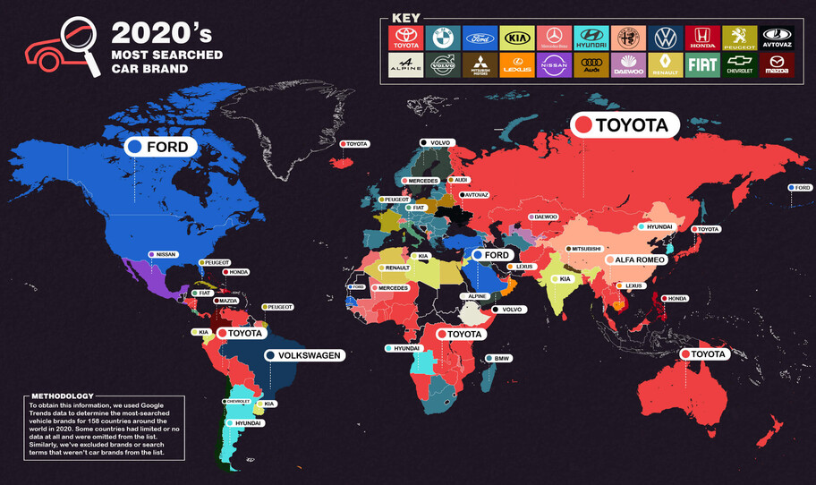 Gracias a que el buscador de Google es utilizado por millones de personas a cada minuto, se genera una base de datos impresionante y que permite saber con exactitud cuáles son las marcas más buscadas en un determinado tiempo y lugar. Así, a partir de Google Trends fue posible descubrir que Toyota resultó ser la marca de autos más buscada en el mundo durante 2020, al encabezar las búsquedas en un 34.98%.