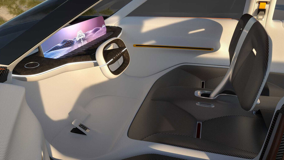 En cuanto al interior de la Surf-Out, sorprende todo. Desde el tablero con su inmensa pantalla y volante rectangular, hasta el diseño de los asientos (si se los puede llamar así) resultan llamativos.